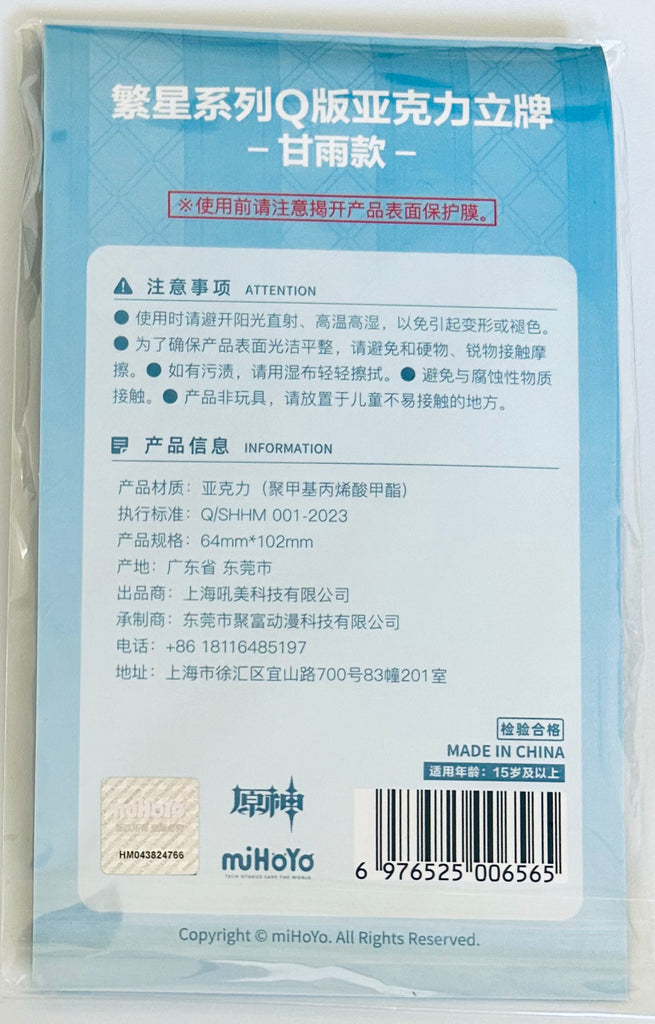 All Genshin Impact items are New from the official Mihoyo Store, so every acrylic will have a clear plastic film to protect it during shipment it is removable.